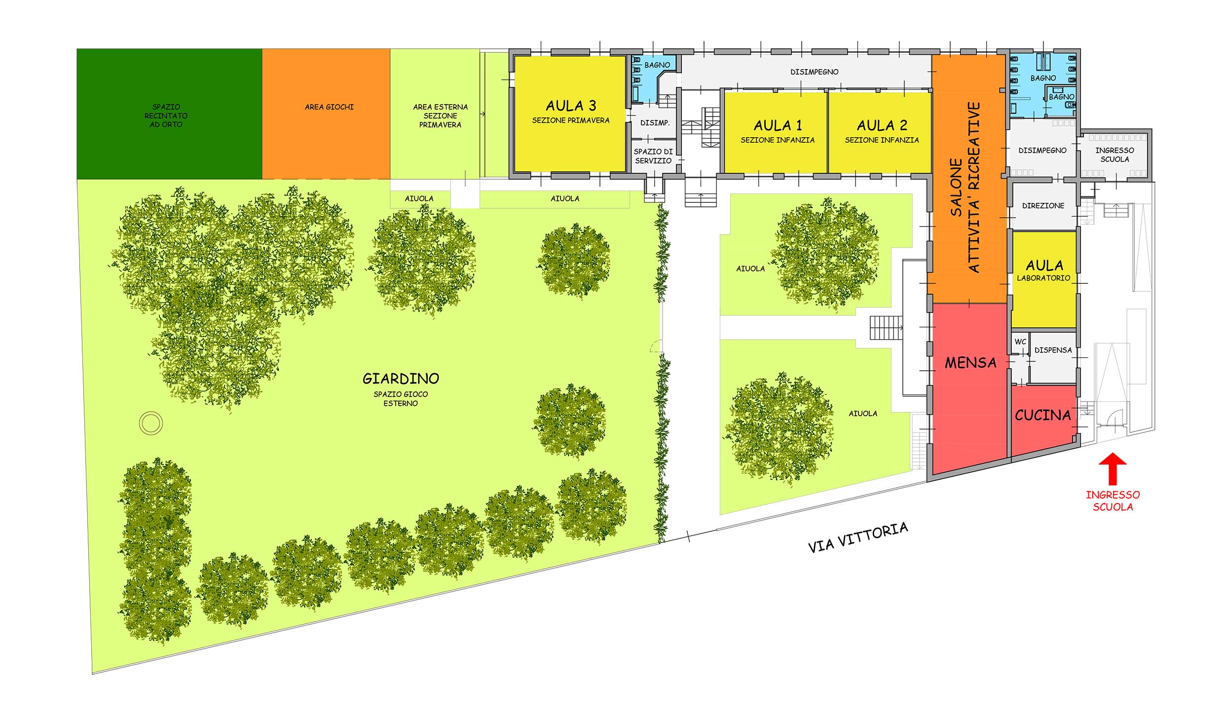 La struttura dispone di un ampio giardino e di spazi interni disposti su un unico piano rialzato. L’accesso allo spogliatoio porta poi al grande salone interno, che collega il locale mensa e la cucina, e il corridoio che porta alle classi didattiche. Al piano interrato è presente un salone adibito a palestra per le attività psicomotorie.